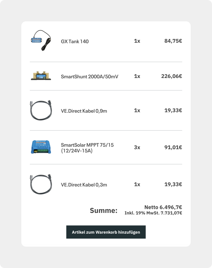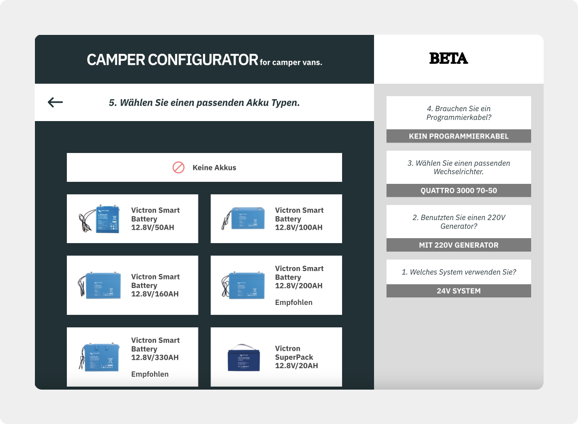 Indem wir gemeinsam einen benutzerfreundlichen Warenkorbkonfigurator für 12V, 24V und 48V Systeme entwickelt haben, konnten wir nicht nur die zeitaufwendige Aufgabe des telefonischen Supports vereinfachen, sondern auch die Kundenzufriedenheit steigern und menschliche Fehler minimieren.